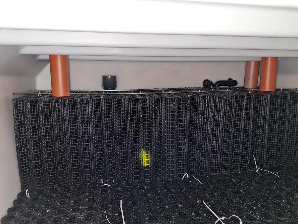 Die ideale Lösung für dieses Projekt war eine ClearFox® Containerkläranlage mit Festbetttechnologie. Das Abwasser fließt zunächst aus den verschiedenen Teilströmen in einem Puffertank zusammen. Dabei handelt es sich um einen unterirdisch verbauten Betontank, welcher zusätzlich die Zuflusspitzen ausgleicht. Danach fließt das Abwasser durch eine Mischstrecke, welche den pH-Wert neutralisiert. Dies ist notwendig, damit die anschließende biologische Behandlung wirkungsvoll ist. Der Festbettreaktor besteht aus Aufwuchskörpern für Mikroorganismen, welche die Verschmutzungen im Abwasser veratmen. Dabei entsteht ein Schlamm, welchen ein Lamellenschrägklärer im Nachgang vom Klarwasser trennt.