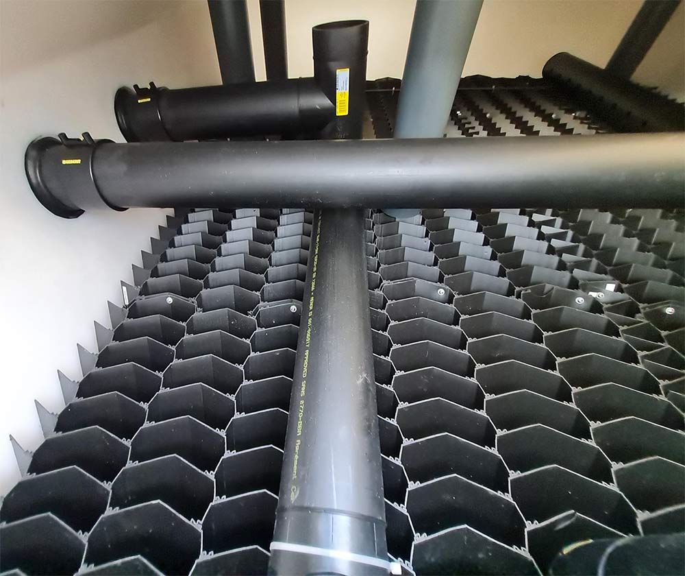 Je höher das Wasser im Lamellenschrägklärer steigt, desto freier ist es von ungelösten Partikeln. Im oberen Teil des Containers befindet sich ein Überlaufwehr, über das das Abwasser aus dem Container fließen kann.