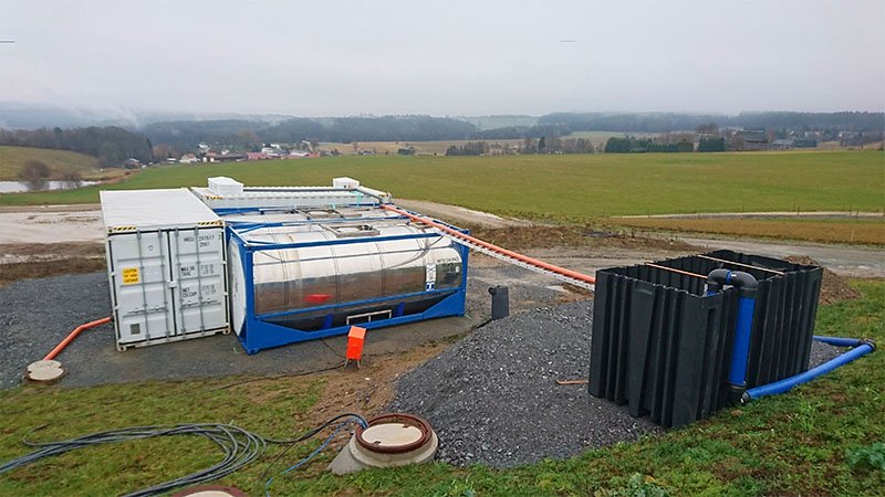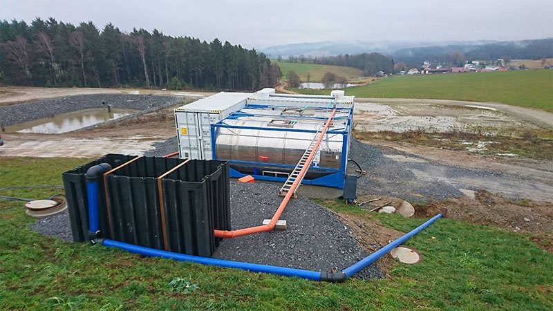 Der Kunde entschied sich für eine schnell verfügbare Leasinganlage, welche das ClearFox®-Team innerhalb kürzester Zeit installierte. Diese bestand aus vier Containermodulen, welche eine Siebung, einen Puffer, einen biologischen Festbettreaktor und ein Nachklärbecken als Lamellenabscheider beinhalteten. Die Siebung entfernt zunächst alle Grobstoffe, wie Stroh und kleine Steine aus dem Abwasser. Von dort gelangt es in ein Misch- und Ausgleichsbeckens welches aus zwei hydraulisch verbunden Tankcontainern besteht. Eine Pumpe beschickt die Anlage, sodass das Abwasser aus der Milchviehhaltung die Biologie und das Nachklärbecken in freiem Fluss durchströmen können.