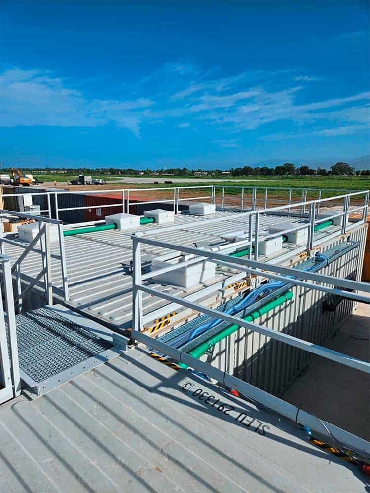 Die standardisierten Containerlösungen sind schnell verfügbar und lassen sich innerhalb weniger Wochen weltweit transportieren, installieren und in Betrieb nehmen, je nach Standort und Projektumfang.
