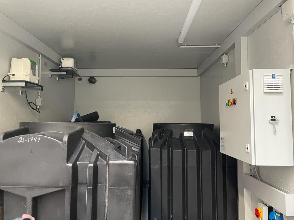 Für dieses Projekt bot die PPU Umwelttechnik GmbH dem Verteidigungsministerium eine vollständige Lösung, verbaut in einem 20 Fuß HC ISO Seecontainer an. Zu Beginn fließt das Abwasser in einen Sammeltank, in dem sich erste grobe Feststoffe absetzen können. Diese dürfen nicht in den biologischen Reaktor gelangen, da sie sonst die Biologie zu stören könnten. Da das Abwasser sehr unregelmäßig in den Sammeltank fließt, gelangt es anschließend in einen Puffertank, der die Zuflussspitzen ausgleicht. Anschließend fließt das Abwasser gleichmäßig in den ClearFox® FBR, welcher dieses biologisch behandelt.