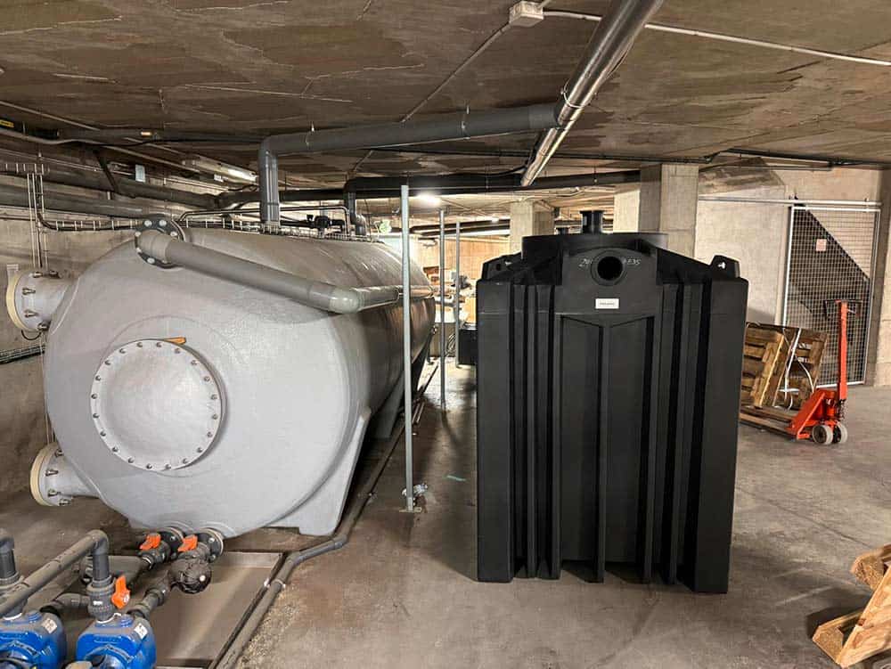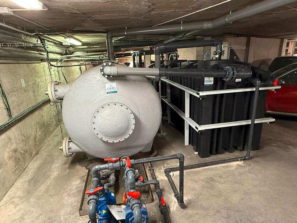 Die gesamte Nachrüstlösung wurde direkt hinter den bestehenden Ablauf montiert und konnte dank der kompakten Modulbauweise ohne Eingriffe in die Altanlage oder Bauarbeiten im Bestand integriert werden.