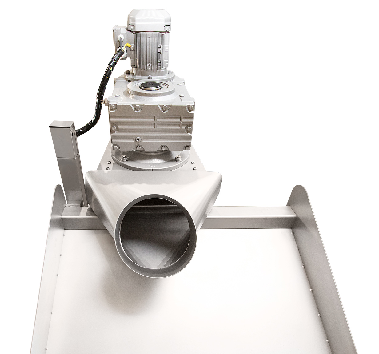 Der Schlamm wird in einen zylindrischen Siebkorb mit einer innenliegenden Förderschnecke eingeleitet. Die Schnecke transportiert den Schlamm langsam weiter, während überschüssiges Wasser durch ein Filtertuch abläuft. Die Feststoffe werden dabei zunehmend verdichtet. Ein automatisches Reinigungssystem hält das Filtertuch sauber und durchlässig. Der eingedickte Schlamm wird am Ende der Anlage gesammelt.