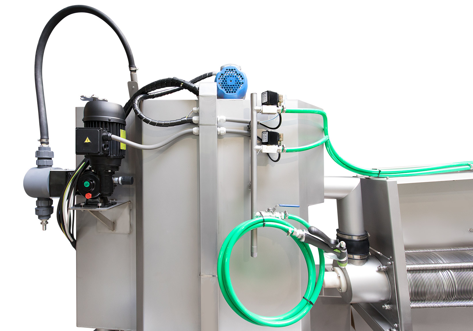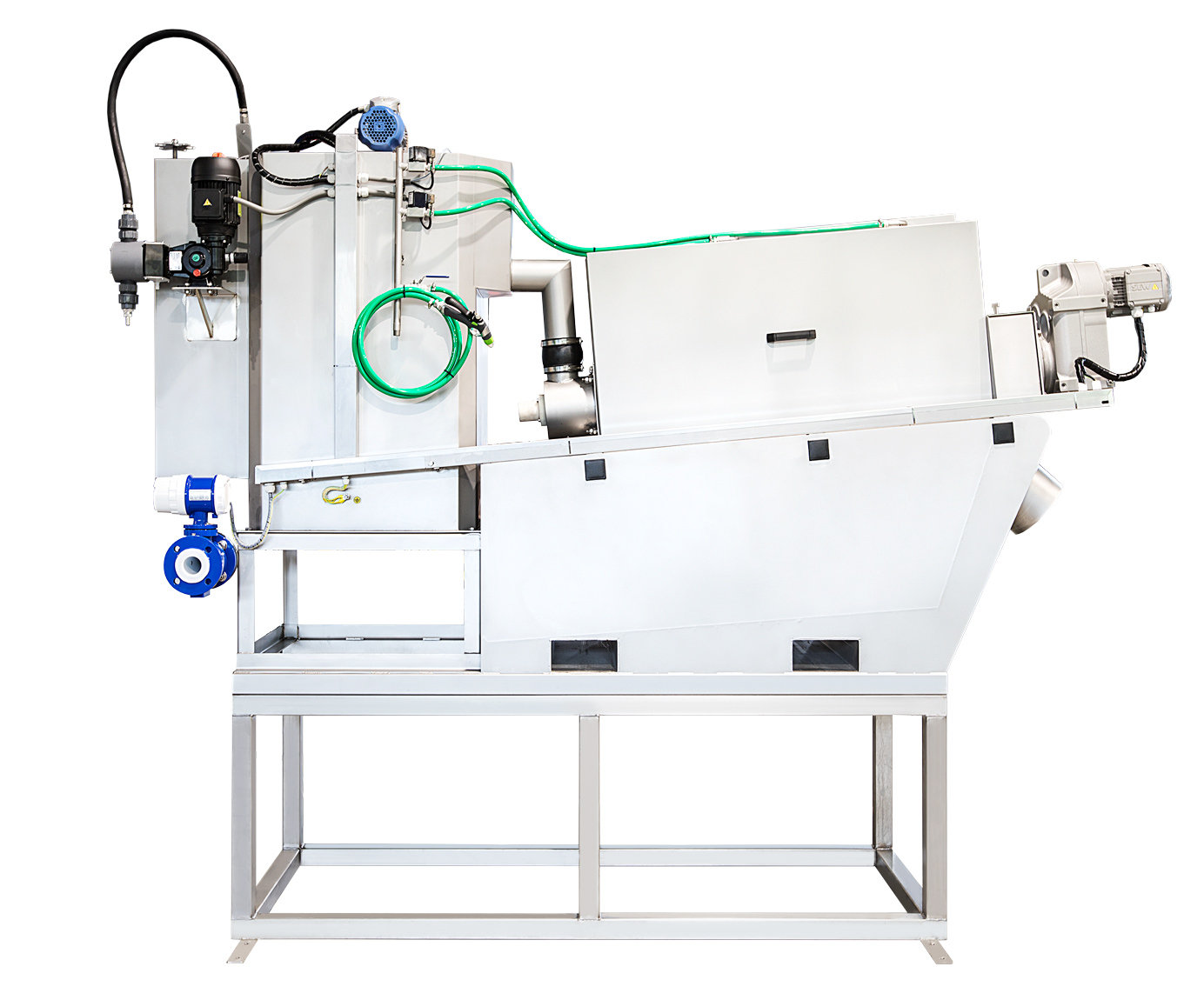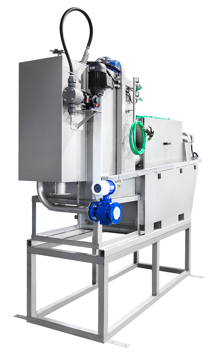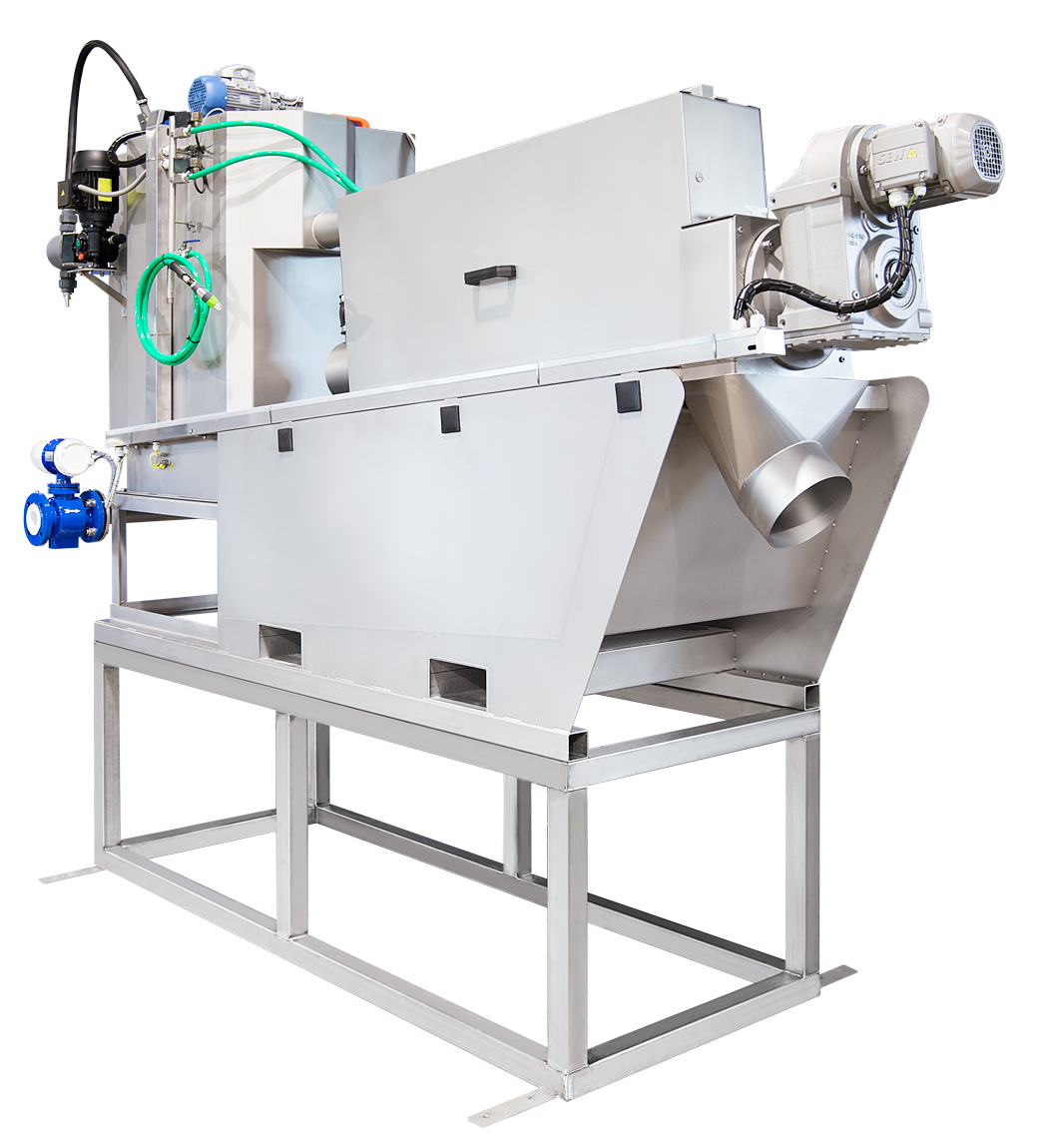 Der Schlamm wird zunächst kontinuierlich in ein zylindrisches Siebgehäuse mit einer integrierten archimedischen Schnecke eingeleitet. Optional kann dem Schlamm zuvor ein Flockungsmittel zugesetzt werden, um feinere Partikel zu größeren Flocken zu binden. Im Inneren des Siebgehäuses befördert die Schnecke den Schlamm langsam in Richtung Auslass. Überschüssiges Wasser wird durch ein umlaufendes Filtertuch nach außen abgeleitet. Die Feststoffe verbleiben im Inneren und werden beim Transport durch die Anlage verdichtet. Ein automatisches Spülsystem hält das langlebige Filtertuch sauber und durchlässig. Der eingedickte Schlamm wird am Ende der Anlage gesammelt und kann zur weiteren Behandlung geleitet werden.