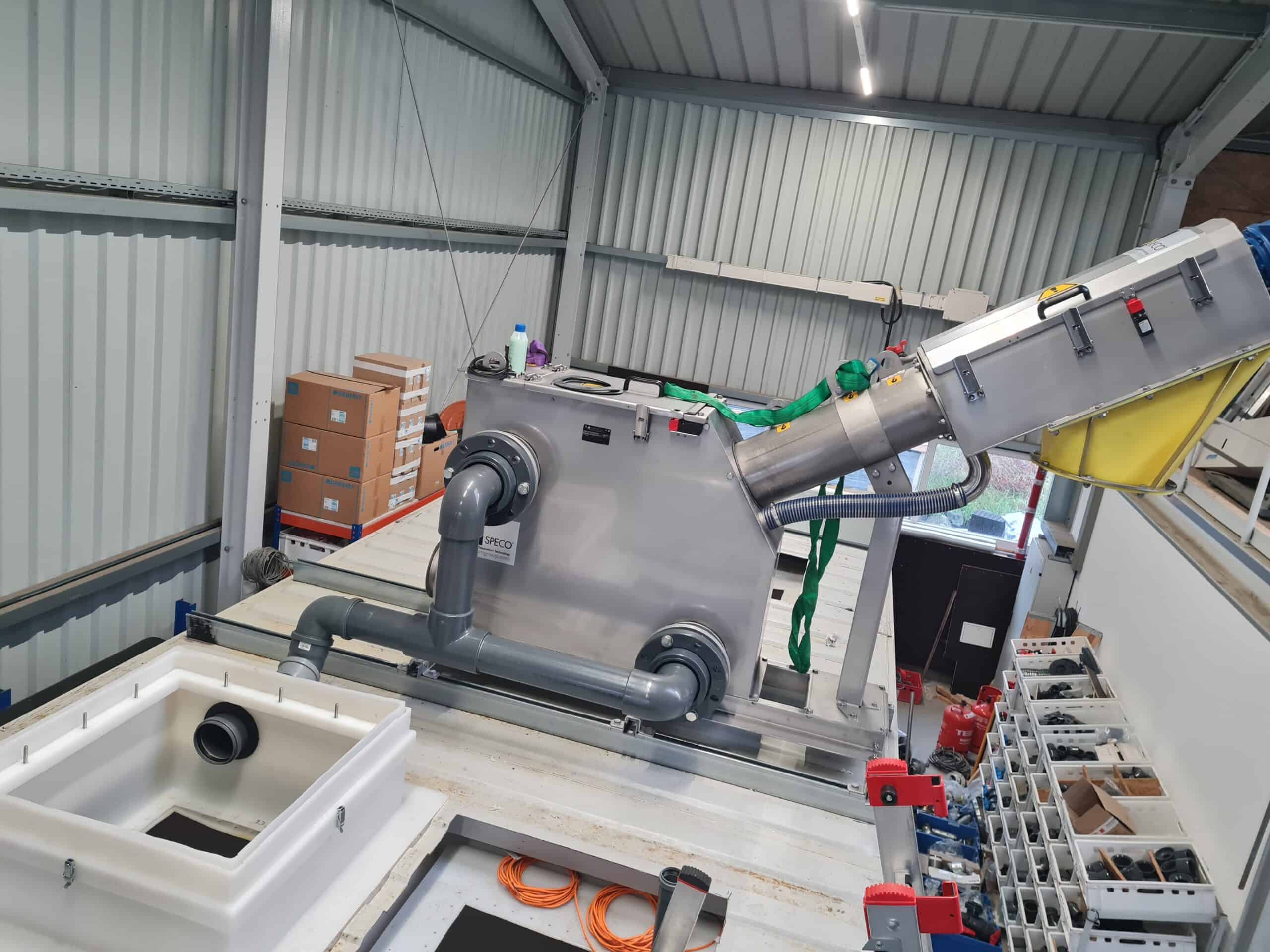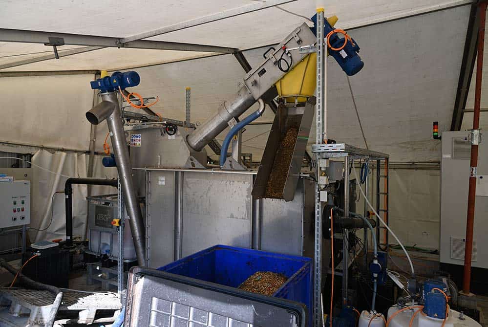 Das Abwasser fließt in die Kompaktanlage, woraufhin ein Schneckensieb die Feststoffe abtrennt. In einem zweiten Schritt erfolgt die Sedimentation und die Entfernung von Sand und Splitt. Im letzten Schritt erfolgt die Abscheidung von Fetten und Ölen über eine Sedimentationsschnecke, welche auf der Wasseroberfläche montiert ist.