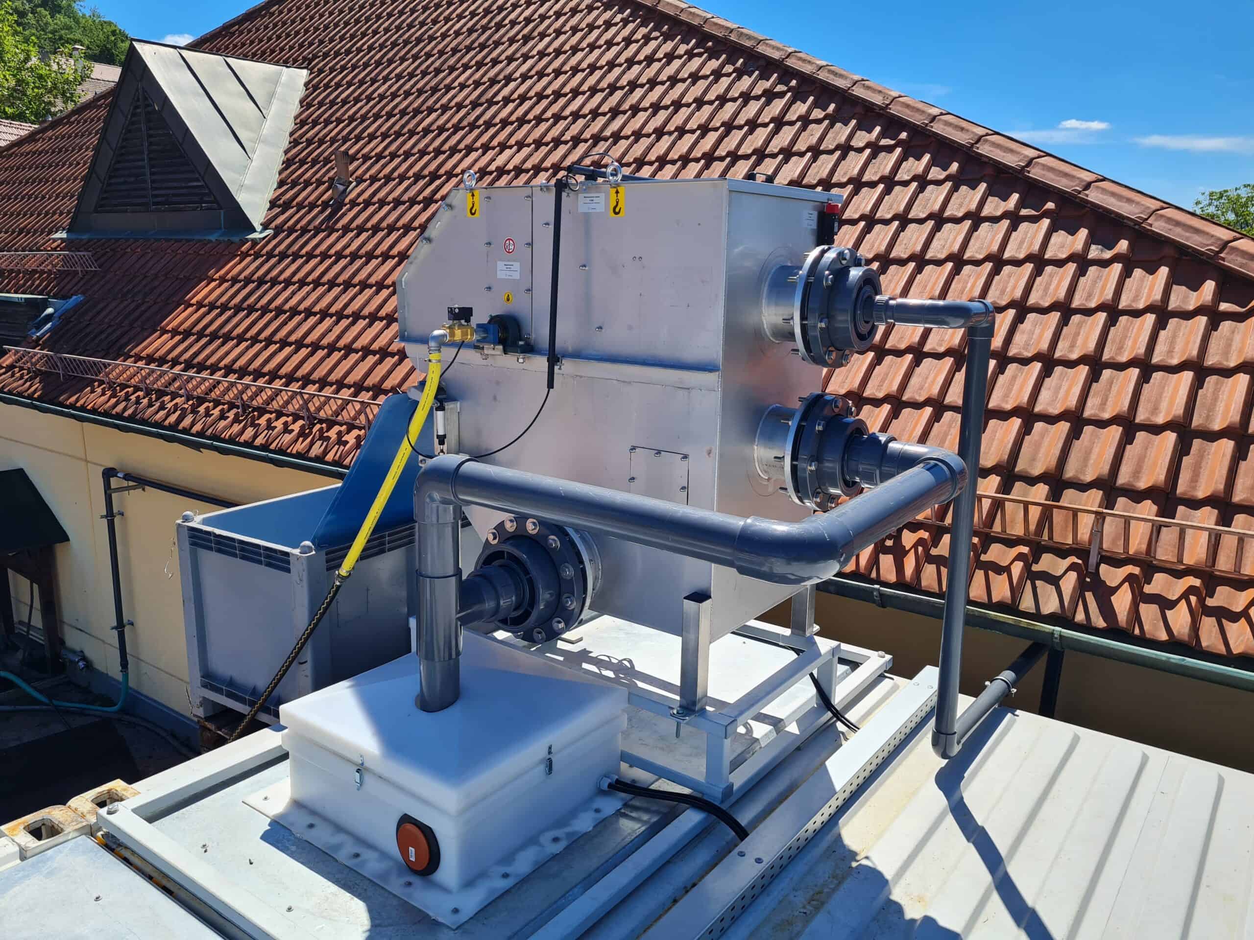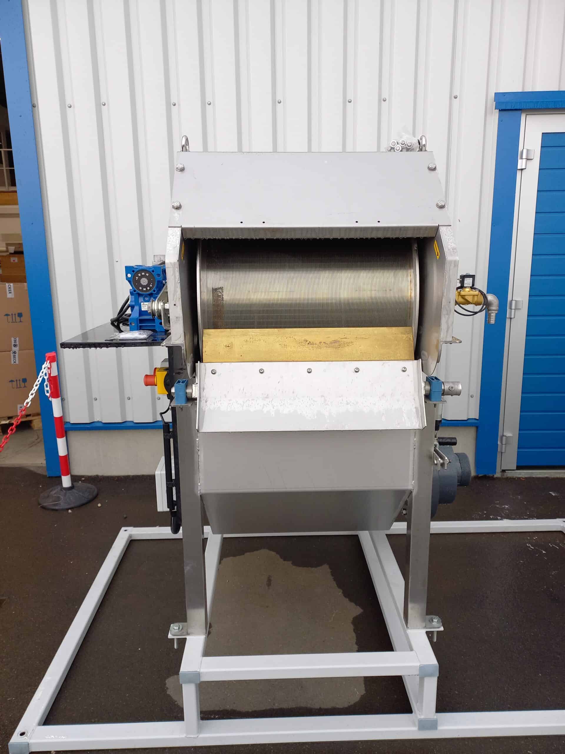 3. Schließlich werden die Feststoffe in kompakter Form in einen nachgeschalteten Sammelbehälter oder in Kunststoffsäcke abgeleitet. Der gesamte Prozess läuft vollautomatisch ab und gewährleistet eine zuverlässige und wartungsarme Vorbehandlung des Abwassers.